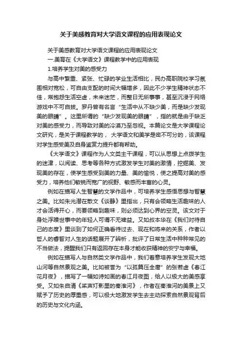 关于美感教育对大学语文课程的应用表现论文关于美感教育对大学语文课程的应用表现论文一.美育在《大学语文》课程教学中的应用表现1.培养学生对美的感受力与高中繁重、紧张、忙碌的学业生活相比,民办高职院校学习氛围相对宽松,可自由支配的时间大幅增多,因此不少学生精神状态不佳,常抱怨生活空虚,未来迷茫,而整日无所事事,甚至沉浸于网络游戏中不可自拔。