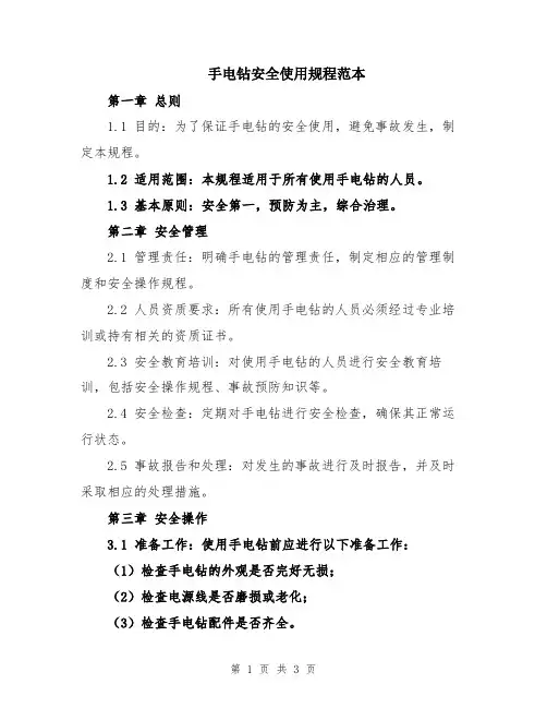 手电钻安全使用规程范本第一章总则1.1 目的:为了保证手电钻的安全使用,避免事故发生,制定本规程。
