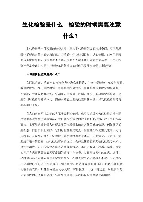 血生化检查注意事项血液生化检查是一项常用的临床检查方法,通过检测血液中各种生化指标的水平,可以帮助医生了解人体内的健康状况和疾病发展情况。