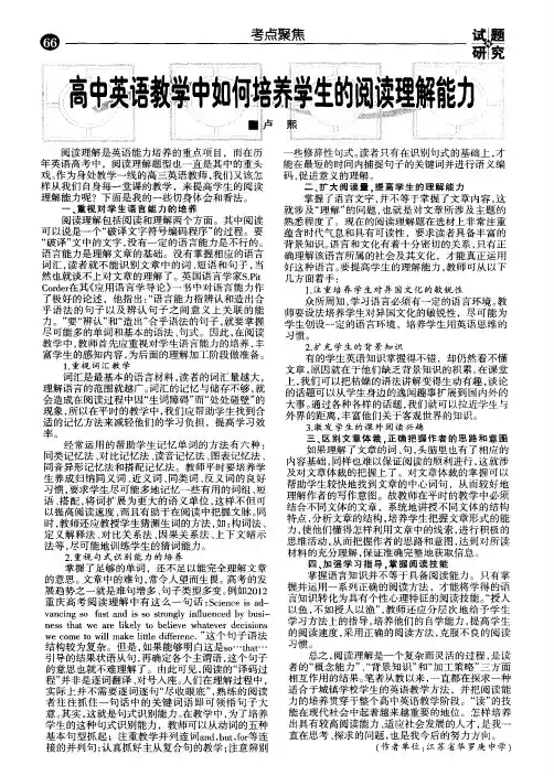 高中英语教学中阅读能力的培养阅读是高中英语教学中的重要环节,它是学生在以后的学习工作中最常用的知识点之一,有良好的阅读能力会给学生的学习与工作带来很多的意义。