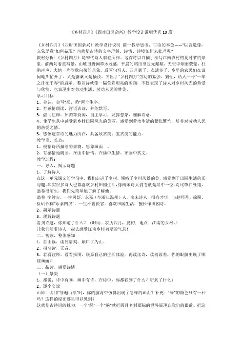 《乡村四月》《四时田园杂兴》教学设计说明优秀10篇《乡村四月》《四时田园杂兴》教学设计说明篇一教学思考:古诗的本色——“以言造像,立象尽意”如何显现?也就是古诗的文字理解、诗情、诗境如何来处理呢?教材分析:《乡村四月》是宋代诗人翁卷所作。