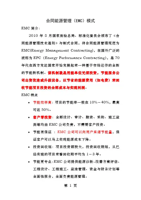 合同能源管理(EMC)模式EMC简介:2010年8月国家质检总局、标准化委员会颁布了《合同能源管理技术通则》与制式合同,将合同能源管理规范为EMC(Energy Management Contracting),在国外广泛的被称为EPC(Energy Performance Contracting),是70年代在西方发达国家开始发展起来一种基于市场运作的全新的节能新机制。