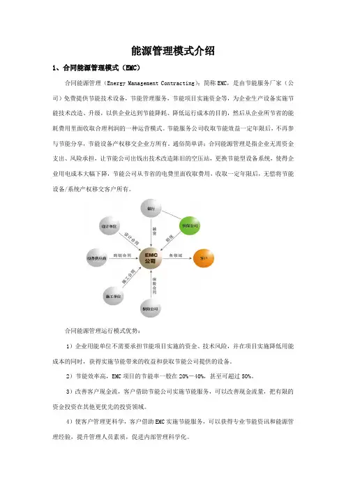 能源管理模式介绍1、合同能源管理模式(EMC)合同能源管理(Energy Management Contracting):简称EMC,是由节能服务厂家(公司)免费提供节能技术设备,节能管理服务,节能项目实施资金等,为企业生产设备实施节能技术改造、升级,以供企业达到节能降耗、降低运行成本的目的,然后从企业所节省的能耗费用里面收取合理利润的一种运营模式。
