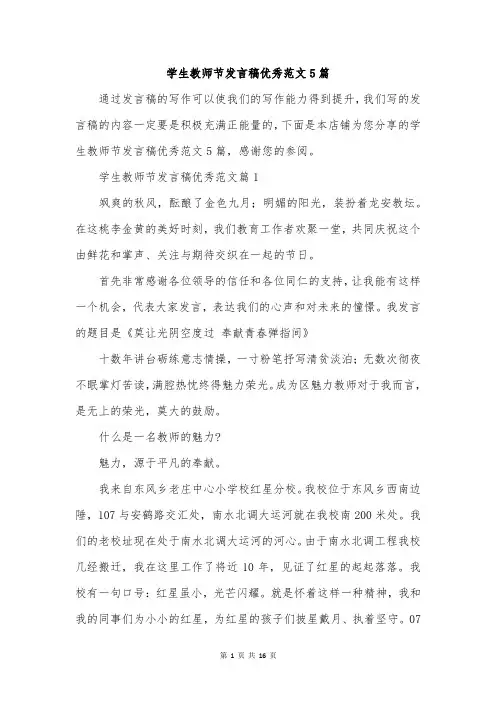 学生教师节发言稿优秀范文5篇通过发言稿的写作可以使我们的写作能力得到提升,我们写的发言稿的内容一定要是积极充满正能量的,下面是本店铺为您分享的学生教师节发言稿优秀范文5篇,感谢您的参阅。