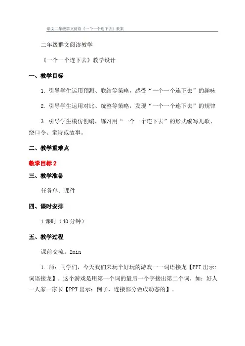 语文二年级群文阅读《一个一个连下去》教案二年级群文阅读教学《一个一个连下去》教学设计一、教学目标1.引导学生运用预测、联结等策略,感受“一个一个连下去”的趣味2.引导学生运用对比、统整等策略,发现“一个一个连下去”的规律3.引导学生模仿创编,练习用“一个一个连下去”的形式编写儿歌、绕口令、童诗或故事。