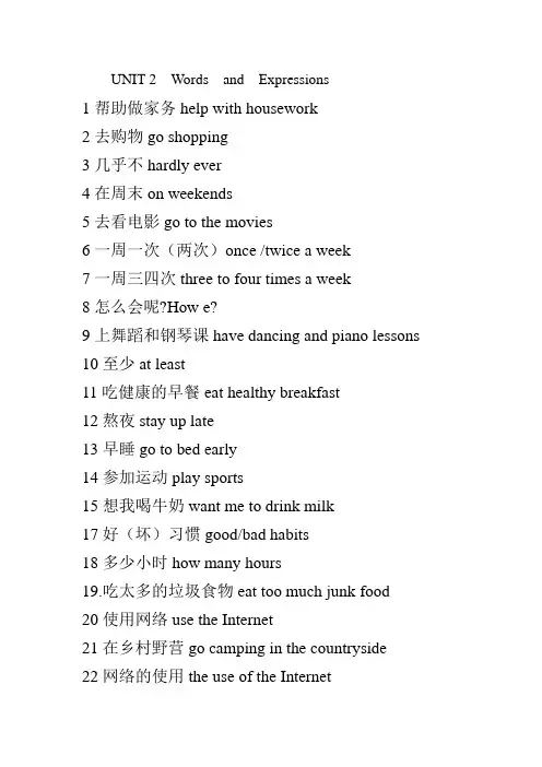 UNIT 2 Words and Expressions1帮助做家务help with housework2去购物go shopping3几乎不hardly ever4在周末on weekends5去看电影go to the movies6一周一次(两次)once /twice a week7一周三四次three to four times a week8怎么会呢?How e?9上舞蹈和钢琴课have dancing and piano lessons 10至少at least11吃健康的早餐eat healthy breakfast12熬夜stay up late13早睡go to bed early14参加运动play sports15想我喝牛奶want me to drink milk17好(坏)习惯good/bad habits18多少小时how many hours19.吃太多的垃圾食物eat too much junk food20使用网络use the Internet21在乡村野营go camping in the countryside22网络的使用the use of the Internet23这儿有些调查的结果Here are the results.24仅仅百分之十五only fifteen percent25一周四到六次four to six times a week26根本不not…at all27上线go online28消遣for fun29这些问题的答案the answers to these questions30通过上网和看游戏节目来放松relax by using the Internet and watching game shows31最好的放松的方法the best way to relax32例如参加运动such as playing sports33和…..度过时光spend time with sb34旧习难改Old habits die hard.34赶快锻炼,不要等到来不及了So start exercising before it’s too late35一个16岁的高中生a sixteenyearold high school student36吃汉堡eat hamburgers37几乎每天hardly every day38不到6小时_less than six hours39保持健康keep healthy40读报read a newspaper41从不上班迟到never be late for work42看英语书read English books43我最喜欢的电视节目my favorite program 44停止吃垃圾食物stop eating junk food45害怕做…be afraid to do sth46向别人求助ask sb for help47 想我不要上线want me not to go online 48休闲时间的活动free time activities4 9学会放松learn to relax50对……有害be bad for。