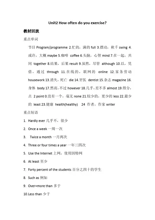 Unit2 How often do you exercise?教材回放重点单词节目Program/programme 2.忙的,满的full 3.摆动,秋千swing 4.或许,大概maybe 5.咖啡coffee 6.头脑,心智mind 7.在一起,共同together 8.结果,后果result 9.虽然,尽管although 10.以,凭借,通过through 11.在线的,联网的online 12.家务劳动housework 13.消失,死亡die 14.牙医dentist 15.杂志magazine 16.身体body 17.然而,不过however 18.几乎,差不多almost 19.得分,点2 point 0.没有一个,毫无none 21.较少的,更少的less 22.最少的least 23.健康health(healthy) 24 作者,作家writer重点短语1.Hardly ever几乎不,很少2.Once a week一周一次3.Twice a month一月两次4.Three or four times a year一年三四次e the Internet上网,使用因特网6.At least至少7.Forty percent of the students百分之四十的学生8.Such as例如9.Over=more than多于10.L ess than少于11.J unk food垃圾食品12.H ow often多久一次13.H elp with housework帮助干家务活14.H ave piano lessons上钢琴课15.S tay up late熬夜16.W ant them to exercise/play sports想要他们做运动17.B e good for her health对她的健康有利18.N o.1 High School students/ students in No.1 High School第一中学的学生19.G o camping in the countryside去乡下野营20.A sk us about eating habits问我们关于我们的饮食习惯21.N ot…at all根本不22.T he way to practice English/ the way of practicing English练习英语的方法23.A n 11-year-old girl一个是十一岁的女孩经典句型1.What do you usually do on weekends? 你周末经常去做什么?I always go shopping.我总是去购物。