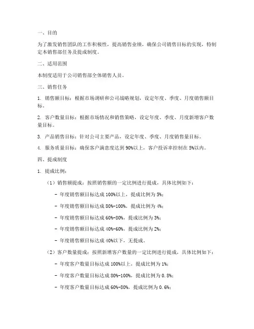 一、目的为了激发销售团队的工作积极性,提高销售业绩,确保公司销售目标的实现,特制定本销售部任务及提成制度。