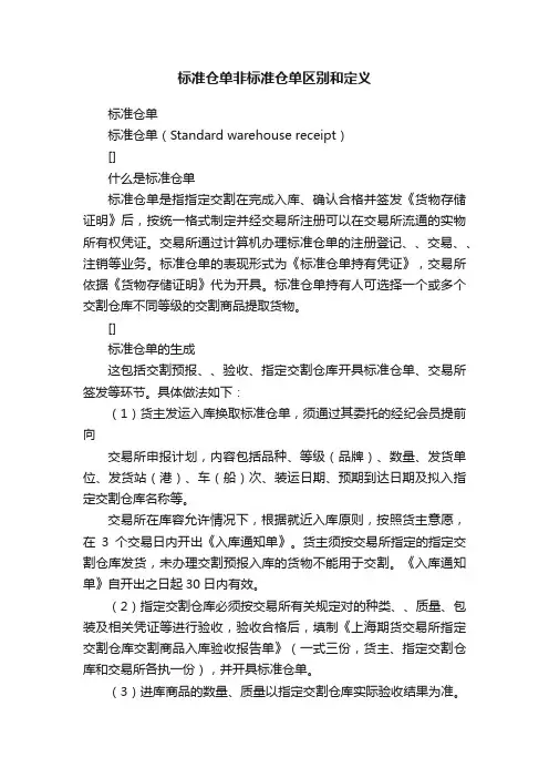 标准仓单非标准仓单区别和定义标准仓单标准仓单(Standard warehouse receipt)[]什么是标准仓单标准仓单是指指定交割在完成入库、确认合格并签发《货物存储证明》后,按统一格式制定并经交易所注册可以在交易所流通的实物所有权凭证。