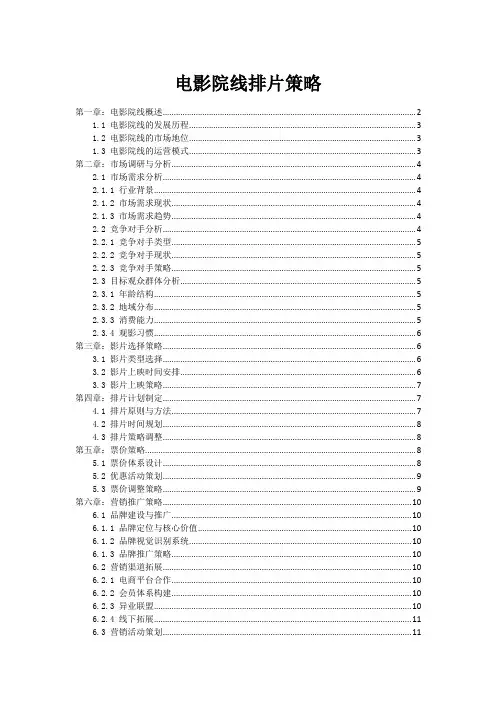 电影院线排片策略第一章:电影院线概述 (2)1.1 电影院线的发展历程 (3)1.2 电影院线的市场地位 (3)1.3 电影院线的运营模式 (3)第二章:市场调研与分析 (4)2.1 市场需求分析 (4)2.1.1 行业背景 (4)2.1.2 市场需求现状 (4)2.1.3 市场需求趋势 (4)2.2 竞争对手分析 (4)2.2.1 竞争对手类型 (5)2.2.2 竞争对手现状 (5)2.2.3 竞争对手策略 (5)2.3 目标观众群体分析 (5)2.3.1 年龄结构 (5)2.3.2 地域分布 (5)2.3.3 消费能力 (5)2.3.4 观影习惯 (6)第三章:影片选择策略 (6)3.1 影片类型选择 (6)3.2 影片上映时间安排 (6)3.3 影片上映策略 (7)第四章:排片计划制定 (7)4.1 排片原则与方法 (7)4.2 排片时间规划 (8)4.3 排片策略调整 (8)第五章:票价策略 (8)5.1 票价体系设计 (8)5.2 优惠活动策划 (9)5.3 票价调整策略 (9)第六章:营销推广策略 (10)6.1 品牌建设与推广 (10)6.1.1 品牌定位与核心价值 (10)6.1.2 品牌视觉识别系统 (10)6.1.3 品牌推广策略 (10)6.2 营销渠道拓展 (10)6.2.1 电商平台合作 (10)6.2.2 会员体系构建 (10)6.2.3 异业联盟 (10)6.2.4 线下拓展 (11)6.3 营销活动策划 (11)6.3.1 节日营销 (11)6.3.2 影片促销 (11)6.3.3 线上线下互动 (11)6.3.4 影迷俱乐部 (11)6.3.5 社会责任活动 (11)第七章:会员管理与服务 (11)7.1 会员体系构建 (11)7.1.1 会员体系概述 (11)7.1.2 会员等级设置 (11)7.1.3 会员积分制度 (11)7.1.4 会员优惠政策 (12)7.2 会员权益设计 (12)7.2.1 会员权益概述 (12)7.2.2 观影权益 (12)7.2.3 优惠权益 (12)7.2.4 增值权益 (12)7.3 会员服务优化 (12)7.3.1 会员服务概述 (12)7.3.2 会员服务流程优化 (12)7.3.3 会员服务渠道拓展 (12)7.3.4 会员服务质量提升 (13)第八章:技术支持与优化 (13)8.1 影院硬件设施升级 (13)8.2 票务系统优化 (13)8.3 影院管理系统升级 (13)第九章:数据分析与决策 (14)9.1 数据收集与分析 (14)9.1.1 数据收集 (14)9.1.2 数据分析 (14)9.2 数据驱动的决策 (14)9.2.1 决策原则 (14)9.2.2 决策流程 (15)9.3 数据监测与预警 (15)9.3.1 数据监测 (15)9.3.2 预警机制 (15)第十章:未来发展展望 (16)10.1 电影市场趋势分析 (16)10.2 影院线业务拓展 (16)10.3 影院线可持续发展策略 (16)第一章:电影院线概述1.1 电影院线的发展历程电影院线作为电影产业链中的重要环节,其发展历程见证了电影产业的繁荣与变革。