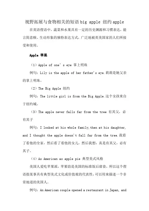 视野拓展与食物相关的短语big apple 纽约apple 在英语俚语中,蔬菜和水果具有一定的历史渊源和习惯表达,能言简意赅、生动形象的独特表达方式,广泛地被英美国家的人们所接受和使用。