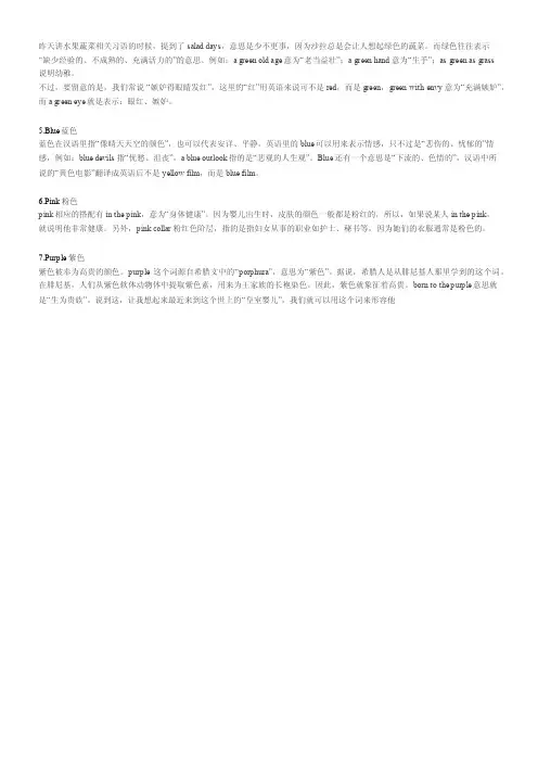 6.Pink 粉色pink相应的搭配有in the pink,意为“身体健康”。
