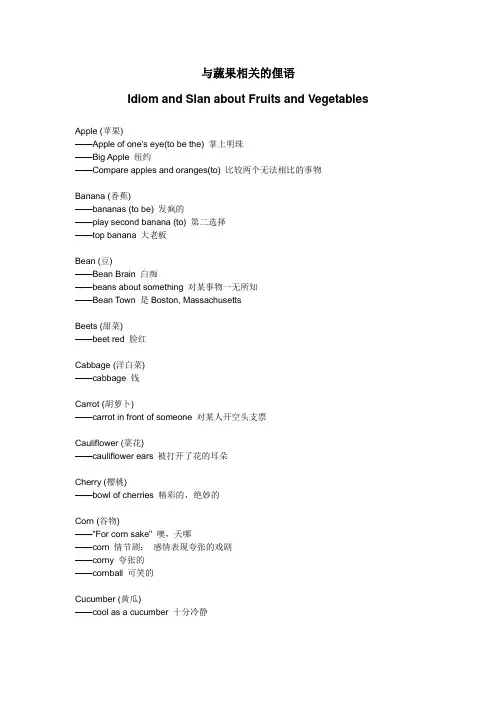 与水果、蔬菜相关的英语俚语与水果、蔬菜相关的英语俚语Apple 苹果1.apple of one's eye (to be the ):to be one's favorite 掌上明珠;心爱物eg. She is the apple of her father's eye.她是她父亲的掌上明珠。