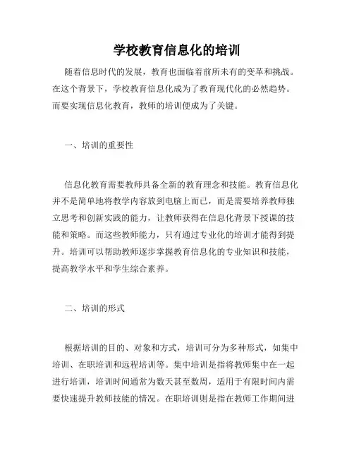 二、培训内容和方式1. 培训内容(1)教师信息化教育培训:a. 提升基本的计算机操作技能,包括操作系统、办公软件、网络等方面的知识和技能。