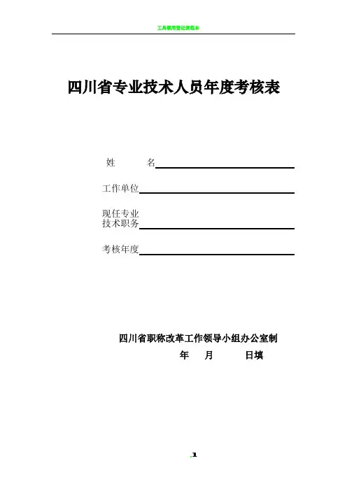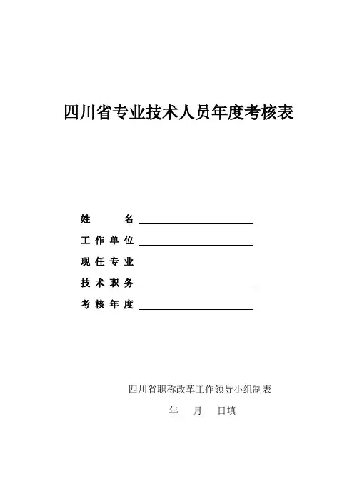 四川省专业技术人员年度考核表姓名————————————————————————工作单位————————————————————————现任专业技术职务————————————————————————考核年度————————————————————————四川省职称改革工作领导小组办公室制二0一0 年月日填。