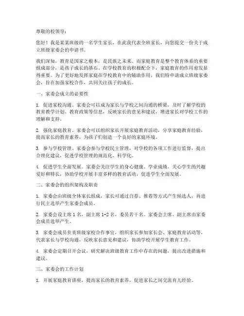 尊敬的校领导:您好!我是某某班级的一名学生家长,在此我代表全班家长,向您提交一份关于成立班级家委会的申请书。