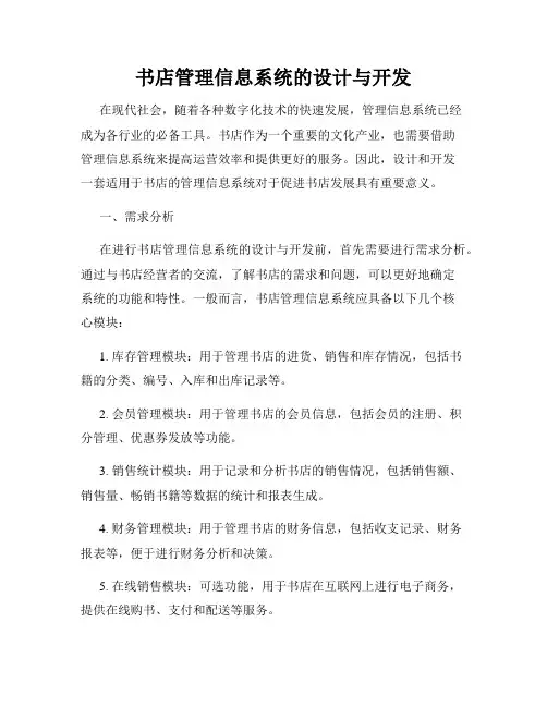 一、需求分析在进行书店管理信息系统的设计与开发前,首先需要进行需求分析。