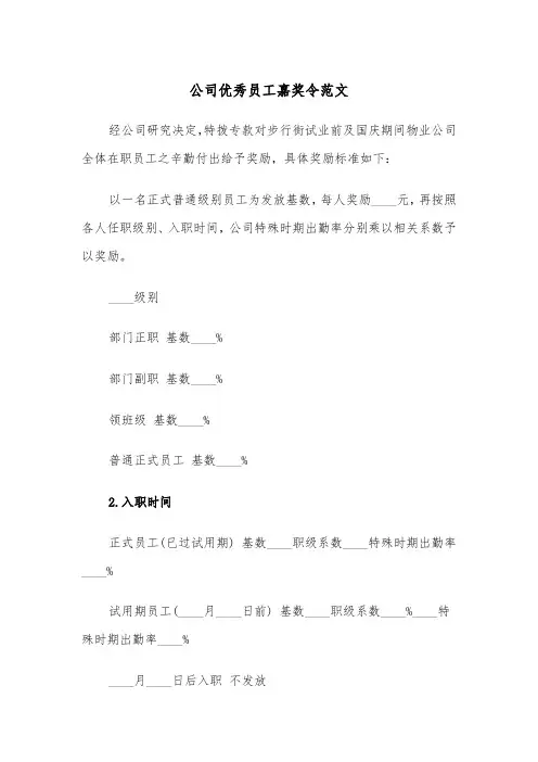 ____级别部门正职基数____%部门副职基数____%领班级基数____%普通正式员工基数____%2.入职时间正式员工(已过试用期) 基数____职级系数____特殊时期出勤率____%试用期员工(____月____日前) 基数____职级系数____%____特殊时期出勤率____%____月____日后入职不发放____月____日~____月____日入职基数____职级系数____%3.特殊时期出勤率____月____日~____月____日全勤基数____职级系数____%未全勤基数____职级系数____%通过上述奖励,希各员工齐心协力,再接再励,为营造美好____步行街多作贡献!____市____物业服务有限公司总经办公司优秀员工嘉奖令范文(2)【公司优秀员工嘉奖令】尊敬的全体员工:在公司的经营发展过程中,我们充分认识到员工的价值和重要性,尤其是那些在工作中表现出色、对公司作出杰出贡献的优秀员工。