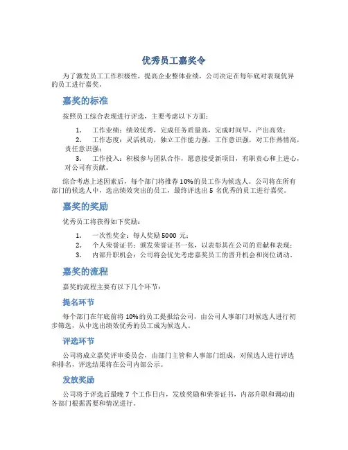具体内容如下:第一条:嘉奖的范围本嘉奖令适用于公司全体员工,不分职能、岗位和层级。