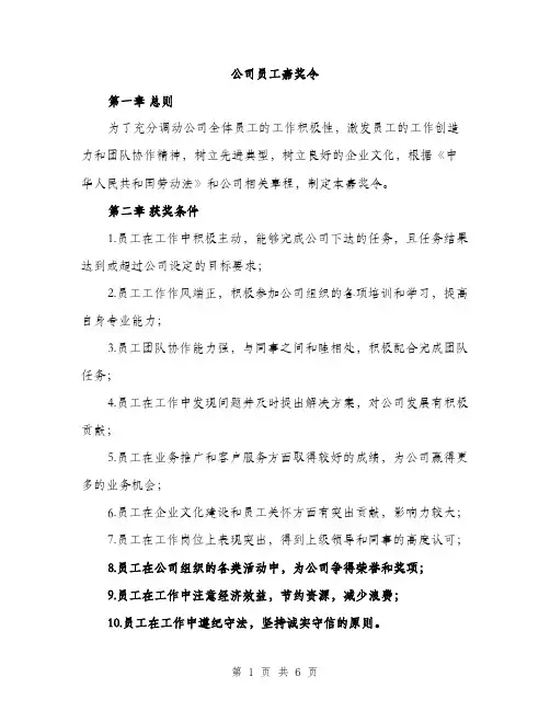 公司员工嘉奖令第一章总则为了充分调动公司全体员工的工作积极性,激发员工的工作创造力和团队协作精神,树立先进典型,树立良好的企业文化,根据《中华人民共和国劳动法》和公司相关章程,制定本嘉奖令。