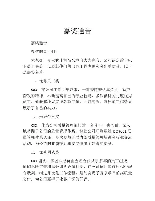 奖励决定通告书尊敬的全体员工:经公司董事会审议,根据公司绩效评估制度和个人工作表现,我们兹决定对以下员工予以表彰和奖励:1. XXX(员工姓名):在过去一年中,您以出色的工作表现和卓越的业绩突出了自己。