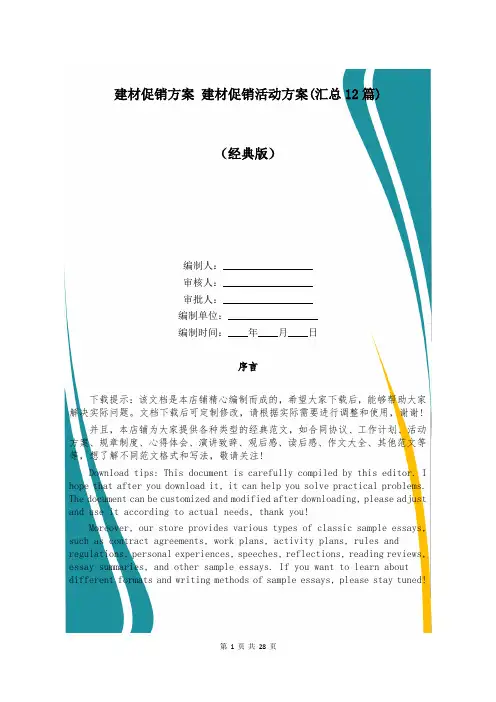 建材促销方案建材促销活动方案(汇总12篇)(经典版)编制人:__________________审核人:__________________审批人:__________________编制单位:__________________编制时间:____年____月____日序言下载提示:该文档是本店铺精心编制而成的,希望大家下载后,能够帮助大家解决实际问题。
