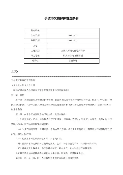 宁波市人民代表大会常务委员会2015年6月12日宁波市历史文化名城名镇名村保护条例第一章总则第一条为了加强历史文化名城、街区、名镇、名村以及历史建筑的保护,继承优秀历史文化遗产,根据国务院《历史文化名城名镇名村保护条例》、《浙江省历史文化名城名镇名村保护条例》和其他有关法律、法规的规定,结合本市实际,制定本条例。