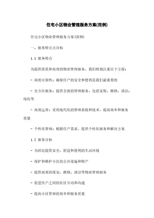 住宅小区物业管理方案范本一、小区概况1.1 小区名称:XXX小区1.2 地理位置:XXX小区位于市中心,交通便利,周边配套设施完善,是一个宜居的住宅小区。