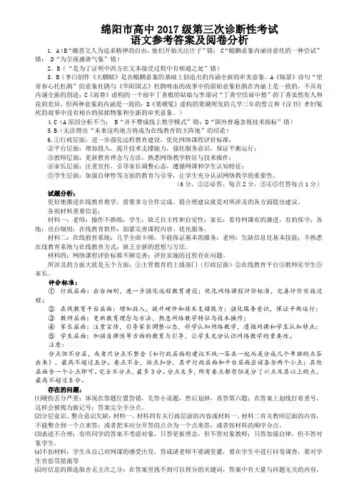 绵阳市高中2017级第三次诊断性考试语文参考答案及阅卷分析1. A(B“魏晋文人为追求精神的自由,他们开始关注庄子”错; C“鲲鹏意象内涵诗意化的一种尝试”错; D“为呈现盛唐气象”错)2.B(“是为了证明中西方在文本接受过程中有相通之处”错)3. B(李白创作《大鹏赋》是在鲲鹏意象的基础上创造出的内涵全新的审美意象。