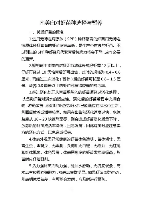 南美白对虾苗种选择与暂养一、优质虾苗的标准1.选用无特定病原体(SPF)种虾繁育的虾苗用无特定病原体种虾繁育的虾苗发病率低,是生产中首选的虾苗。