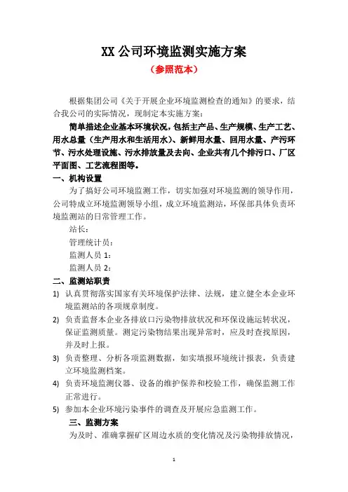 二、监测范围和对象1. 监测范围:本计划主要针对企业生产过程中可能产生的环境污染源进行监测,包括但不限于废气、废水、废固等的排放情况。