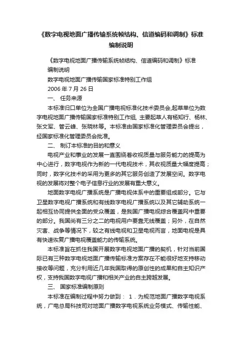 《数字电视地面广播传输系统帧结构、信道编码和调制》标准编制说明《数字电视地面广播传输系统帧结构、信道编码和调制》标准编制说明数字电视地面广播传输国家标准特别工作组2006年7月26日一、任务来源本标准归口单位为全国广播电视标准化技术委员会,起草单位为数字电视地面广播传输国家标准特别工作组, 主要起草人有杨知行、杨林、张文军、管云峰、张晓林等。