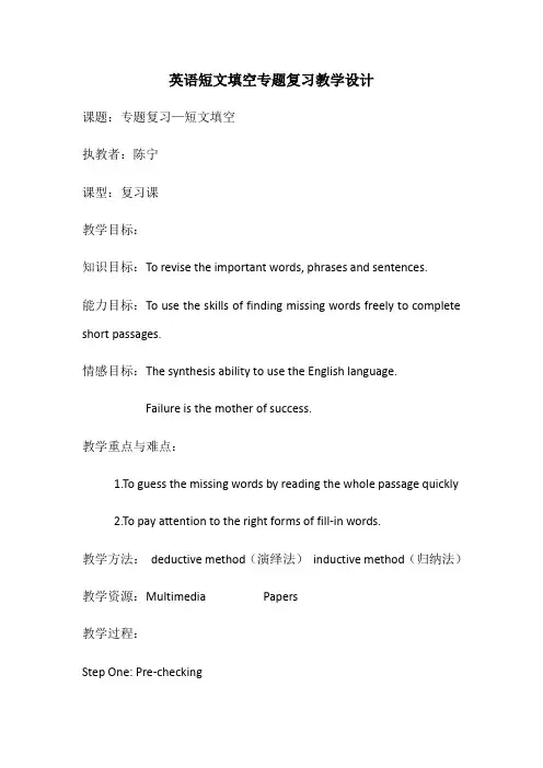 英语短文填空专题复习教学设计课题:专题复习—短文填空执教者:陈宁课型:复习课教学目标:知识目标:To revise the important words, phrases and sentences.能力目标:To use the skills of finding missing words freely to complete short passages.情感目标:The synthesis ability to use the English language.Failure is the mother of success.教学重点与难点:1.To guess the missing words by reading the whole passage quickly2.To pay attention to the right forms of fill-in words.教学方法:deductive method(演绎法)inductive method(归纳法)教学资源:Multimedia Papers教学过程:Step One: Pre-checkingFree talkStep Two: Presentation1. Ask the students to do ten one-choice questions.(通过做这十道单项选择题是为了让学生了解到英语中词性的变换)(1). Rose received a letter full of love from her parents on her _____ birthday.A elevenB eleven’sC eleventhD the eleventh(2). He is too_____ to go to school. After all, he is only three years old.A oldB youngC youngerD youngest(3). All singers kept together. As a result, their performance was _____ .A successfulB successC succeedD successfully(4). I have been there many _____ since the earthquake.A timeB timesC in timeD on time(5). The old lady ______ in the street and broke her leg.A fell downB fall downC fell intoD fallen into(6). They are the friends of my ______.A fatherB fathersC father’sD fathers’(7). I will make this computer work even if I have to ______all night.A stay upB stays at homeC stayed upD staying at home(8). The disease attacked him _______.A suddenB suddenly(9). I _______ to try my best to get good grades.A promisedB promisesC promisingD promise(10). My father is ______ the family these years.A supportB supportedC supportsD supporting2.The teacher and the students fill in the blanks according to the reading passage.(通过做这道短文填空是为了让学生感悟这种题的解题技巧)When I was a young boy, what I admired(羡慕)most was the boy who rode a bike here and there. I had asked my father many__1___ to buy me a bike, but he always told me that I was too __2___ to ride a bike.Finally, I owned my bike on my __3___ birthday. I wanted to ride it very much, so my father __4___ to teach me on the weekend.It was fine that weekend, and I was excited. My father told me not to look down but to ___5__ straight up. I rode very well at first because my father was__6___ the bike behind me. But he __7___ let go of thebike without my knowing and as a result I __8___ down from the bike. I cried for help, but my father asked me to ride again. So little by little, I learned how to keep the balance(平衡)without my __9___ help. I was able to ride a bike after a few days.Failure(失败) is the mother of __10___. Never be afraid of falling down. They are what I learned from the experience of riding a bike.3. The summary after the exercise(例如:中考短文填空的特点,英语中词性的变换以及短文填空的结题技巧)(习题讲解之后的小结是为了给学生呈现一个完整的解题技巧)Step Third: ExerciseAsk two students to do the exercise with the same type on the blackboard and the teacher comments on the students’ performance.(通过此步骤主要是让所有学生巩固本节课所学知识并向他人学习或者从错误中学习)Have you ever planted a few trees on Tree ___1___ Day? Each year, ___2___of people, both old and young, plant a lot of trees. But this may not be the best way to make your home a greener place. Last week we visited a park in Hebei. We were ___3___ to find most of the trees hadbeen burned. The workers told us that the trees died soon after they were planted because they were not watered __4____ enough. So the workers burned __5____ and cleaned the place for new trees to be planted this year. On a card found in one of the dead trees, a student ____6__, “I hope this tree will grow up with me to __7____the backbone(栋梁) of ____8__country.” The workers said that the survival of the trees was really __9____ important than how many trees were planted. Some people in Beijing now have a new idea that they can donate some money and let professional(专业人士)plant and take ___10___ of the trees.Step Four: Summary解题技巧归纳:1.浏览所给单词,掌握其词性和意思。