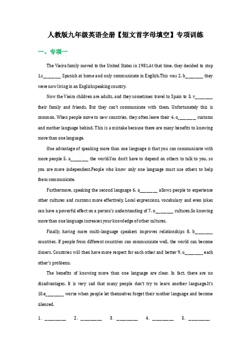 人教版九年级英语全册【短文首字母填空】专项训练一、专项一The Vieira family moved to the United States in 1981.At that time, they decided to stop 1.s___________ Spanish at home and only communicate in English.This was 2. b___________ they were now living in an Englishspeaking country.Now the Vieira children are adults, and they sometimes travel to Spain to 3. v___________ their family and friends. But they can't communicate with them. Unfortunately this is common. When people move to new countries, they often leave their 4. o___________ customs and mother language behind. This is a mistake because there are many benefits to knowing more than one language.One advantage of speaking more than one language is that you can communicate with more people 5. a___________ the world.You don't have to depend on others to talk to you, so you are more independent.People who know only one language must use others to help them communicate.Furthermore, speaking the second language 6. a___________ allows people to experience other cultures and customs more effectively. Local expressions, vocabulary and even jokes can have a powerful effect on a person's understanding of 7. o___________ cultures.So knowing more than one language increases your knowledge of other cultures.Finally, having more multi-language speakers improves relationships 8. b___________ countries. If people from different countries can communicate well, the world can become closers. Countries will then have more respect for each other and better 9. u___________ each other's problems.The benefits of knowing more than one language are clear. In fact, there are no disadvantages. It is very sad that many people don't try to learn another language.It's 10.e___________ worse when people let themselves forget their mother language and become silenced.1._____________2._____________3._____________4._____________5._____________6._____________7._____________8._____________9._____________10._____________【答案】1.speaking2.because3.visit4.own5.around 6.also7.other8.between9.understand 10.even 二、专项二Sixteen years ago a boy gave me an important gift.It was a smile.It was the 1. e___________ autumn of my first year at a middle school, and my old school was far away. As a result, no one knew who I was. I was very 2. l___________ , and afraid to speak to anyone.Every time I 3. h___________ the other students talking and laughing. I felt my heart break.I couldn't talk with anyone about my problems.Then one day, 4. w___________ my classmates were talking happily with their friends. I was sitting at my desk unhappily as usual. At that moment, a boy entered the classroom. I didn't know who he was. He passed by me and then turned back. He looked at me with a smile.Suddenly, I felt the touch of something bright and friendly. It made me 5. f___________ happy and warm. That smile changed my 6. l___________ . I started to talk with other students and made friends. Day by day, I became 7. c___________ to everyone in my class. The boy with the lucky smile has become my best friend now.One day I asked him 8. w___________ he had smiled. but he couldn't remember doing so!It doesn't matter because all the dark days have 9. g___________ . I believe that the world is what you think it is.If you think it is lonely. you might always be alone. So smile at the world 10.a___________ it will smile back.1._____________2._____________3._____________4._____________5._____________ 6._____________7._____________8._____________9._____________10._____________【答案】1.early 2.lonely3.heard4.when5.feel 6.life7.closer8.why9.gone10.and 三、专项三Sometimes I really doubt 1. w___________ hether there is love between my parents.Every day they are very 2. b___________ trying to make money for my schooling.One day, my mother was sewing a quilt(缝被子).I silently sat 3. b___________ her.“Mom, is there love 4. b___________ you and Dad?”I asked in a very low voice.With 5. s___________ in her eyes, she stopped her work for a while.Then she said,“Susan, look at this thread(线).It can 6. h___________ be seen, but it's really there.It makes the quilt strong. If life is a quilt, love should be a thread. Love is inside. ”I couldn't 7. u___________ her until the next spring. At that time, my father suddenly got sick seriously. My mother had to stay with him in the hospital for a month.After they were back, my mother 8. h___________ my father walk slowly on the country road every day. They were so 9. k___________ to each other and it seemed they were the happiest couple.After two months my father still couldn't walk by himself.“Dad, how are you feeling now?”I asked him one day.“Susan, don't 10. w___________ about me.”he said.“I just like walking with your mom.I like this kind of life.”Reading his eyes, I knew he loves my mother deeply.Now I understand that love is just a thread in the quilt of our life.Love is inside, making life strong and warm.1._____________2._____________3._____________4._____________5._____________ 6._____________7._____________8._____________9._____________10._____________【答案】1.whether2.busy3.beside4.between5.surprise6.hardly7.understand8.helped9.kind10.worry 四、专项四Once a small boy lived on a farm which seemed so far away from everywhere.He needed to get up early 1. b___________ sunrise every morning to help his father on the farm. During sunrise he would take a break and climb up on the fence(篱笆) along the side of the farm. He could see a house with golden windows.“If they could afford golden windows, then there must be other nice things inside the house.”He imagined how great it would be to 2. l___________ there. Then he promised himself,“Some day I will go there and see this wonderful 3. p___________ .”One morning, his father would go to the town and told him to 4. s___________ at home for a rest. Knowing that this was his chance, he took a sandwich and headed 5. a___________ the