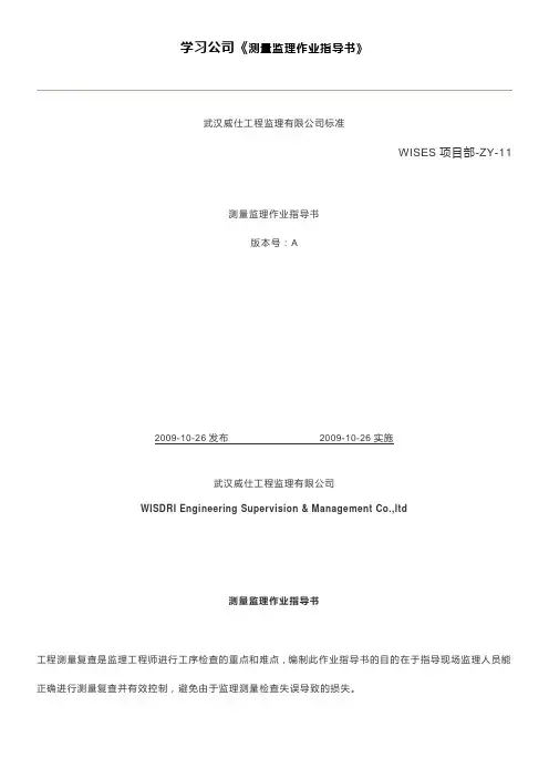 学习公司《测量监理作业指导书》武汉威仕工程监理有限公司标准WISES项目部-ZY-11测量监理作业指导书版本号:A2009-10-26发布2009-10-26实施武汉威仕工程监理有限公司W ISDRI Enginee ring Supervision & Ma na geme nt Co.,ltd测量监理作业指导书工程测量复查是监理工程师进行工序检查的重点和难点,编制此作业指导书的目的在于指导现场监理人员能正确进行测量复查并有效控制,避免由于监理测量检查失误导致的损失。