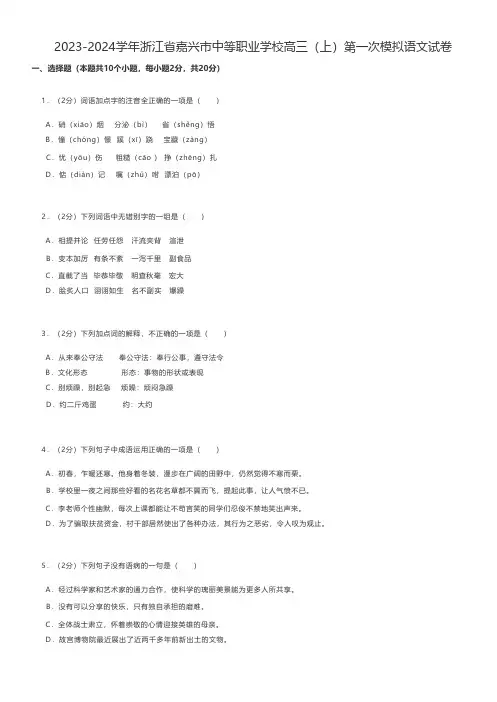 2023-2024学年浙江省嘉兴市中等职业学校高三(上)第一次模拟语文试卷一、选择题(本题共10个小题,每小题2分,共20分)1.(2分)词语加点字的注音全正确的一项是( )A.硝(xiāo)烟 分泌(bì) 省(shěng)悟B.憧(chóng)憬 蹊(xī)跷 宝藏(zàng)C.忧(yōu)伤 粗糙(cāo ) 挣(zhēng)扎D.惦(diàn)记 嘱(zhǔ)咐 漂泊(pō)2.(2分)下列词语中无错别字的一组是( )A.相提并论 任劳任怨 汗流夹背 渲泄B.变本加厉 有条不紊 一泻千里 副食品C.直截了当 毕恭毕敬 明查秋毫 宏大D.脍炙人口 诩诩如生 名不副实 爆躁3.(2分)下列加点词的解释,不正确的一项是( )A.从来奉公守法 奉公守法:奉行公事,遵守法令B.文化形态 形态:事物的形状或表现C.别烦躁,别起急 烦躁:烦闷急躁D.约二斤鸡蛋 约:大约4.(2分)下列句子中成语运用正确的一项是( )A.初春,乍暖还寒。