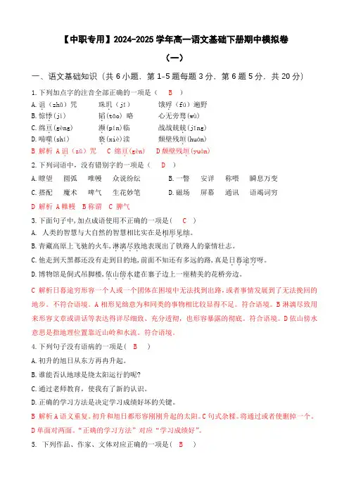 【中职专用】2024-2025学年高一语文基础下册期中模拟卷(一)一、语文基础知识(共6小题,第1-5题每题3分,第6题5分,共20分)1.下列加点字的注音全部正确的一项是(B)A.诅.(zhǔ)咒珠玑.(jī)饿殍.(fú)遍野B.惊悸.(jì) 韬.(tāo) 略心无旁骛.(wù)C.绵亘.(gèng) 濒.(pín)临战战兢兢.(jīng)D.啃噬.(shí) 亵.(xiè)渎颓壁残垣.(huán)B 解析 A诅.(zǔ)咒C 绵亘.(gèn) D颓壁残垣.(yuán)2.下列词语中,没有错别字的一项是( D )A.瞭望圆弧唯幔众说纷纭B.一瞥安详称喂瞬息万变C.搭配魔术啤气生花妙笔D.磁场屏幕通讯语竭词穷D 解析 A帷幔 B称谓 C 脾气3.下面句子中,加点成语使用不正确的一项是( C )A. 人类的智慧与大自然的智慧相比实在是相形见绌....。