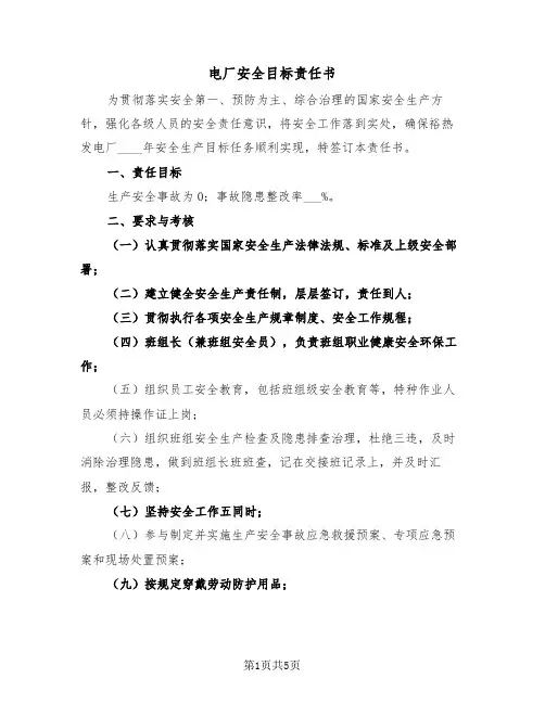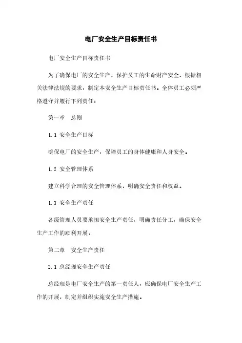 电厂安全目标责任书第一章总则第一条为建立健全电厂安全管理机制,防范和化解各类安全风险,确保公司生产经营的安全稳定,根据《中华人民共和国安全生产法》、《电力公司安全生产管理办法》及公司有关规章制度的要求,制定本目标责任书。
