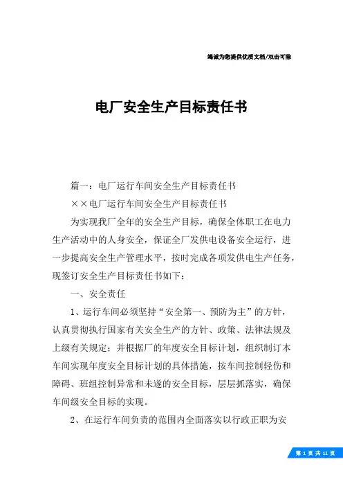 竭诚为您提供优质文档/双击可除电厂安全生产目标责任书篇一:电厂运行车间安全生产目标责任书××电厂运行车间安全生产目标责任书为实现我厂全年的安全生产目标,确保全体职工在电力生产活动中的人身安全,保证全厂发供电设备安全运行,进一步提高安全生产管理水平,按时完成各项发供电生产任务,现签订安全生产目标责任书如下:一、安全责任1、运行车间必须坚持“安全第一、预防为主”的方针,认真贯彻执行国家有关安全生产的方针、政策、法律法规及上级有关规定;并根据厂的年度安全目标计划,组织制订本车间实现年度安全目标计划的具体措施,按车间控制轻伤和障碍、班组控制异常和未遂的安全目标,层层抓落实,确保车间级安全目标的实现。