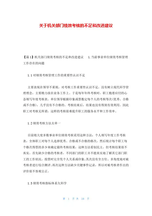 关于机关部门绩效考核的不足和改进建议【篇1】机关部门绩效考核的不足和改进建议 1.当前事业单位绩效考核管理工作存在的问题1.1对绩效考核管理工作的重要性认识不足主要表现在领导不重视,对考核工作重要性认识不足,没有树立现代科学管理理念,主要精力放在业务工作上。