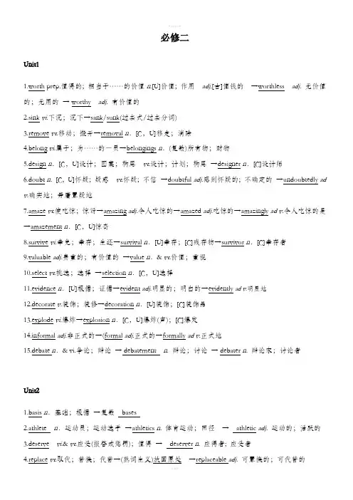 必修二Unit11.worth prep.值得的;相当于……的价值n.[U]价值;作用adj.[古]值钱的→worthless adj.无价值的;无用的→ worthy adj.有价值的2.sink vi.下沉;沉下→sank/sunk(过去式/过去分词)3.remove vt.移动;搬开→removal n.[C,U]移走;消除4.belong vi.属于;为……的一员→belongings n.(复数)所有物;财物5.design n.[C,U]设计;图案;构思vt.设计;计划;构思→designer n.[C]设计师6.doubt n.[C,U]怀疑;疑惑vt.怀疑;不信→doubtful adj.感到怀疑的;不确定的→undoubtedly ad v.确实地;毋庸置疑地7.amaze vt.使吃惊;惊讶→amazing adj.令人吃惊的→amazed adj.吃惊的→amazingly ad v.令人吃惊的是→amazement n.[C,U]惊奇8.survive vi.幸免;幸存;生还→survival n.[U]幸存;[C]残存物→survivor n.[C]幸存者9.valuable adj.贵重的;有价值的→value n.& vt.价值;重视10.select vt.挑选;选择→selection n.[C,U]选择11.evidence n.[U]根据;证据→evident adj.明显的;明白的→evidently ad v.明显地12.decorate v.装饰;装修→decoration n.[U]装饰;[C]装饰品13.explode vi.爆炸→explosion n.[C,U]爆炸(声);[C]爆发rmal adj.非正式的→(formal adj.正式的→formally ad v.正式地15.debate n.& vi.争论;辩论→ debatement n.辩论;讨论→ debater n.辩论家;讨论者Unit21.basis n.基础;根据→复数bases2.athlete n.运动员;运动选手→athletics n.体育运动;田径→ athletic adj.运动的;活跃的3.deserve vi.& vt.应受(报答或惩罚);值得→ deserver n.应得者; 应受者4.replace vt.取代;替换;代替→(熟词生义)放回原处→replaceable adj. 可置换的;可代替的5.swift adj.快的;迅速的→swiftly adv.迅速地;敏捷地→比较级: swifter →最高级: swiftestpete vi.比赛;竞争→competition n.[C,U]竞争;比赛→competitive adj.竞争的;有竞争性的→competitor n.[C]竞争者7.admit vt.& vi.容许;承认;接纳→admission n.[U]准入;准许8.volunteer n.[C]志愿者adj.志愿的;义务的vt.& vi.自愿→voluntary adj.志愿的;自愿的9.regular adj.规则的;定期的;常规的→regularly ad v.经常地;规则地→(irregular adj.不规则的;不定期的10.physical adj.物理的;身体的→physically ad v.物理地;身体地→physics n.物理11.responsibility n.[C]责任;职责→responsible adj.有责任心的→responsibly ad v.负责任地12.advertise vt.& vi.做广告;登广告→advertiser n.[C]广告商→advertisement n.[C]广告13.host vt.做东;主办;招待n.[C]主人→hostess n. [C]女主人;女房东14.pain n.[C,U]疼痛;痛苦→painful adj.痛苦的;疼痛的→painfully ad v.令人痛苦地;吃力地15.hopeless adj.绝望的→(hopeful adj.有希望的→hopefully ad v.充满希望地;有望Unit31.character n.性格;特点→ characteristic n. 特点;特性adj. 独特的,特有的2.technology n.工艺;科技;技术→ technological adj.科技的;工艺的3. analytical adj. 分析的→ analyze vt. 分析;解析4.arise vi.出现;发生→arose/arisen(过去式/过去分词)5.solve vt.解决;解答→solution n.[C]解决;解决办法6.simplify vt.简化→simplified adj.简化的→simple adj.简单的→simply ad v.简单地;仅仅7.intelligent adj.智能的;聪明的→intelligence n.[U]智力;聪明;智能8.total adj.总的;整个的n.[C]总数;合计vt.共计;总计;把……加起来→totally ad v.完全地;整个地9.personal adj.私人的;个人的;亲自的→personally ad v.就个人而言;亲自→personality n.[C,U]个性;性格10.application n.[C,U]应用;用途;申请→apply v.应用;涉及;申请→applicant n.[C]申请人11.explore vt.& vi.探索;探测;探究→explorer n.[C]探险家;勘探者→exploration n.[U]探索12.appearance n.[C,U]外观;外貌;(常用单数)出现→appear vi.出现→(disappear vi.消失13.reality n.[U]真实;[C]事实→real adj.真实的→(unreal adj.不真实的→really ad v.真实地14.finance n.[U]金融;财政→financial adj.财政的;金融的→financially ad v.财政上;金融上15.logical adj.合逻辑的;合情理的→ logically adv.逻辑上;合逻辑地16.happiness n.幸福;快乐→happy adj. 高兴的;幸福的17. supporting adj.支持的;支撑的→ support vt. 支持;支撑;供养n. 支持;支撑→ supporter n. 支持者;拥护者18.type n.类型vt. & vi. 打字→ typist n. 打字员→ typical adj.特有的;典型的→ typically adv.典型地19.electronic adj.电子的→ electronics n.电子学;电子器件→ electronical adj. 电子的20. mop n.拖把vt. 用拖把拖;擦→ 过去式: mopped → 过去分词: mopped → 现在分词: mopping Unit41.inspect vt.检查;视察→ inspection n.[C,U]检查2.certain adj.确定的;某一;一定→(uncertain adj.不确定的→certainty n.[U]确定3.hunt vt.& vi.打猎;猎取;搜寻→hunter n.[C]猎人4.decrease vi.& vt.减少;(使)变小或变少→ ( increase vi.& vt.增加→increasingly ad v.渐增地5.appreciate vt.鉴赏;感激→(熟词生义)意识到→appreciation n.[U]感激;感谢6.contain vt.包含;容纳;容忍→container n.[C]容器7.affect vt.影响;感动;侵袭→affection n.喜爱;感情→effect n.[C,U]影响;效果;作用8.succeed vi.成功vt.接替;继任→success n.[C,U]成功→successful adj.成功的→successfully ad v.成功地9.employ vt.雇用;利用(时间、精力等) →employer n.[C]雇主→employee n.[C]雇员;雇工→employment n.雇用;使用;就业→(unemployment n.[U]失业;失业率10.respond vi.回答;响应;做出反应→ response n.[C,U]回答;反应11.distant adj.远的;远处的→ distance n.[C,U]距离;远方12.relief n.[U] (痛苦或忧虑的)减轻或解除;减轻痛苦的事物→relieve vt.使减轻;缓解13.harm n.[U]& vt.损害;危害→harmful adj.有害的→(harmless a dj.无害的14.protection n.[U]保护→ protect vt.保护→ protective adj.保护的;给予保护的15.mercy n.[U]仁慈;宽恕;怜悯→merciful adj.仁慈的;怜悯的→mercifully ad v.仁慈地;怜悯地16.importance n.[U]重要性→ important adj