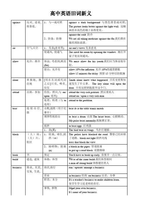 重点高中英语旧词新义————————————————————————————————作者:————————————————————————————————日期:2against 反对, 逆着,倚靠着, 1、与…成对照against a dark background 与黑色背景成对照;The picture looks better against the light wall. 这幅画挂在浅色的墙上显得更美。