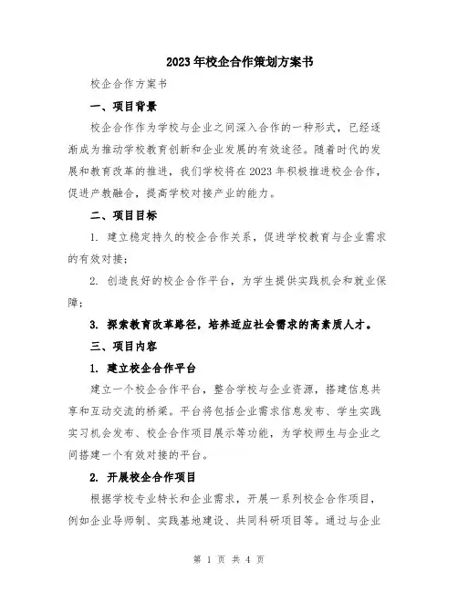 2023年校企合作策划方案书校企合作方案书一、项目背景校企合作作为学校与企业之间深入合作的一种形式,已经逐渐成为推动学校教育创新和企业发展的有效途径。