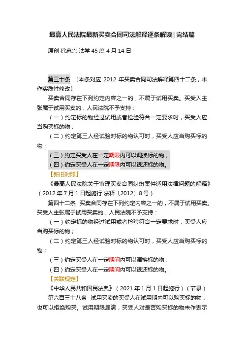 最高人民法院最新买卖合同司法解释逐条解读‖完结篇原创徐忠兴法学45度 4月14日第三十条〔本条对应2012年买卖合同司法解释第四十二条,未作实质性修改〕买卖合同存在下列约定内容之一的,不属于试用买卖。