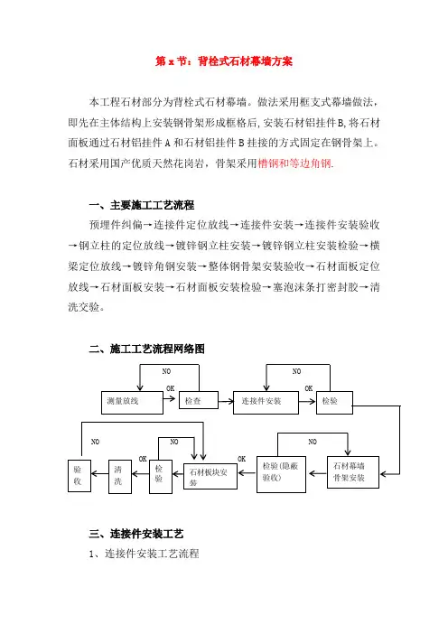二、材料准备1. 背板:背板是施工干挂石材幕墙的基础材料,主要由钢板或者钢型材制成,根据具体项目需求选择合适的材料规格和厚度。