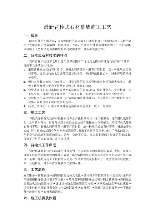 背栓式石材幕墙施工方案一、施工概述背栓式石材幕墙施工方案是一种常见的幕墙施工方式,通过使用背栓将石材固定至幕墙系统上。