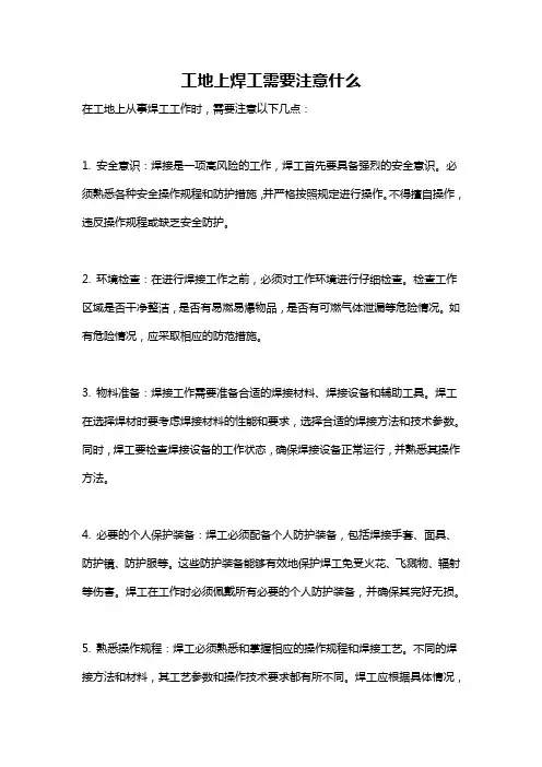 工地上焊工需要注意什么在工地上从事焊工工作时,需要注意以下几点:1. 安全意识:焊接是一项高风险的工作,焊工首先要具备强烈的安全意识。