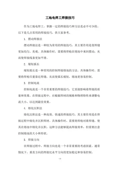 二、焊接前的准备工作1. 清理焊接场地:在进行焊接作业之前,需要清理焊接场地并确保其平整、干净无杂物。