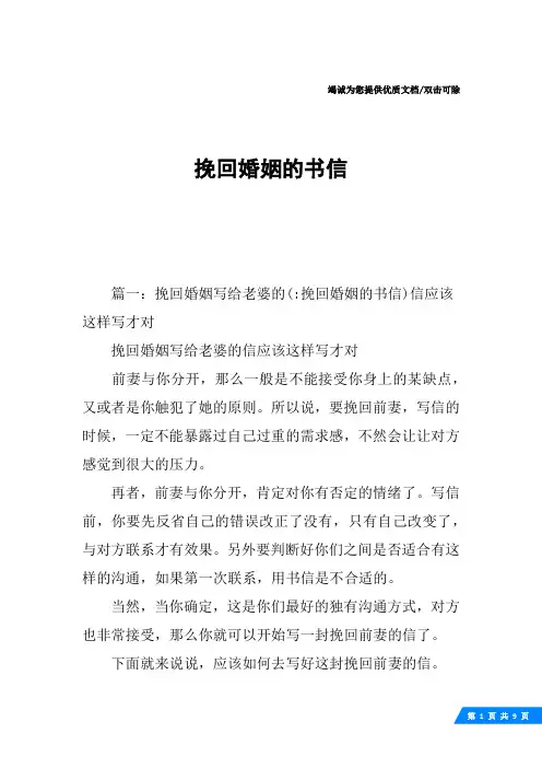 竭诚为您提供优质文档/双击可除挽回婚姻的书信篇一:挽回婚姻写给老婆的(:挽回婚姻的书信)信应该这样写才对挽回婚姻写给老婆的信应该这样写才对前妻与你分开,那么一般是不能接受你身上的某缺点,又或者是你触犯了她的原则。