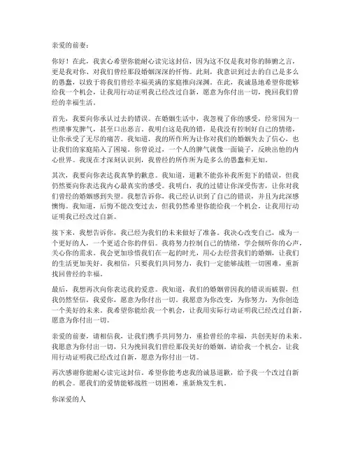 亲爱的(妻子的名字):在此,我深感懊悔和自责,因为我的一时冲动和无知,使得我们的婚姻陷入了危机。